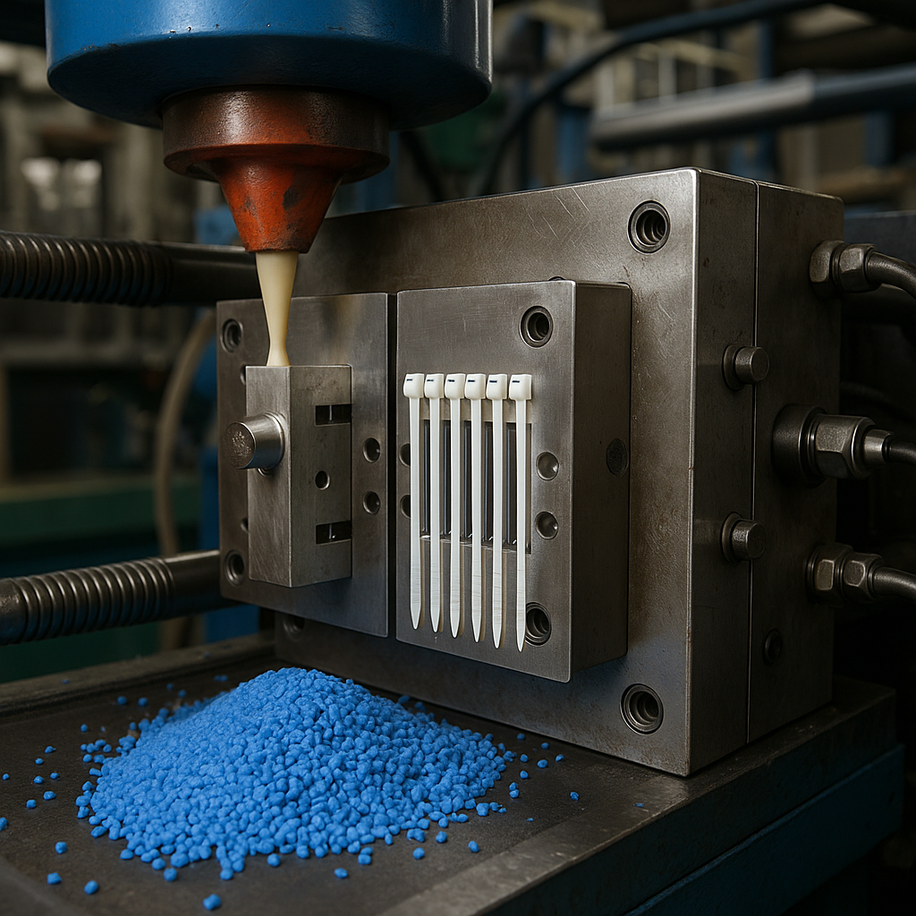 This molten nylon is injected under high pressure into steel molds shaped like the final cable tie — complete with the locking head and teeth.