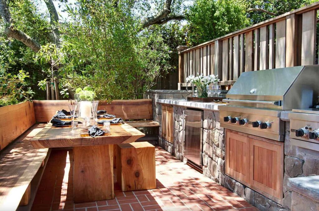 Create a warm and welcoming dining experience with this beautiful rustic outdoor kitchen. The kitchen includes a professional-grade grill, ample counter space, a built-in fridge, and serving areas.
