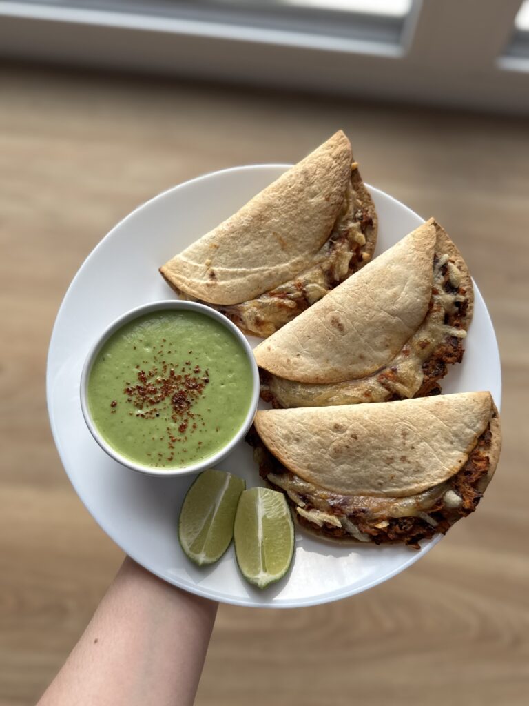 For this quick and delicious tacos you simply sauté a chopped onion in a pan, add the tomato paste, your preferred spices and a splash of water. Adding in your kidney beans (or minced beef) and slightly mashing them. Throw together the parsley or cilantro into a mixer, add the sour cream and a splash of freshly squeezed lime juice and mix well together. Preheat your oven at 160°C at top and bottom heat. Layer your baby tortillas with the filling and add a good amount of shredded cheese on top. Bake for 10 minutes and then enjoy with the fresh dip.