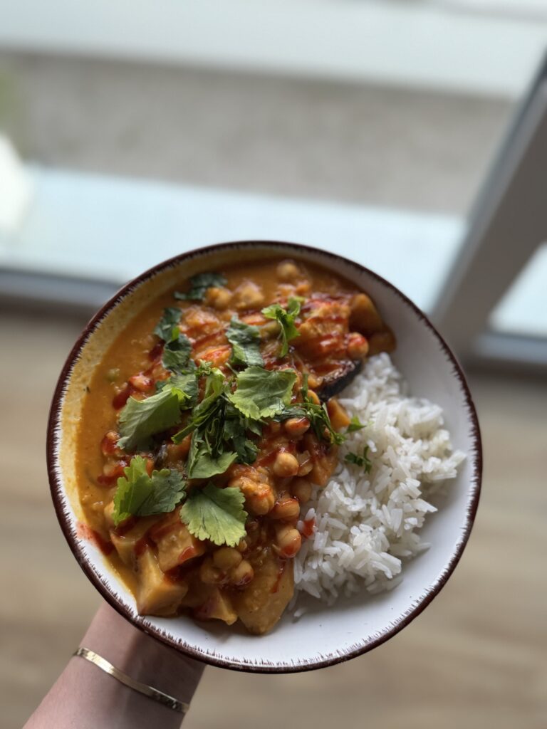 When the weather gets colder, meals get warmer – this hearty red lentil curry will warm you from the inside. Start by washing your red lentils and set them aside. Finely chop your onion and garlic into cubes. Heat up your pan with olive oil and sauté first the onions for 4-5 minutes, then add the garlic and sauté for 2 more minutes. Now it’s time to let the flavours bloom: add your lentils, tomato paste and your spices and let everything roast for a few minutes. Now add the canned tomatoes, choose between vegetable stock and coconut oil and let everything simmer for 15 minutes until the lentils spread and reach a thick and creamy consistency. Serve with white basmati or jasmine rice and top with cilantro and sourc cream.
