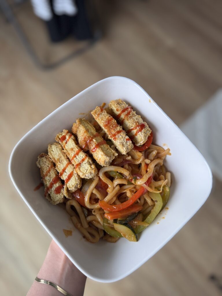 This Udon noodle chicken katsu will level up your next friday night in. Just heat up your pan with some olive oil and throw in your washed and cut up veggies, sauté them on high heat for just a few minutes so your veggies can retain most of their nutrients and there is still some crunch. Add in your teriyaki sauce and let everything simmer for just 3-4 minutes, and then turn down the heat and add your Udon noodle. These just need 2-3 minutes to soften and get chewy. In the meantime, pat dry your tofu and cut in 1,5cm thick slices. Prepare your breading though by mixing flour and milk, add spices if you like, and then coat with bread crumbs. The only thing left to do is to pan fry them in some oil. Time to serve: plate your plate with the Udon noodle and add your katsu slices on top, garnish with some hot and then enjoy.